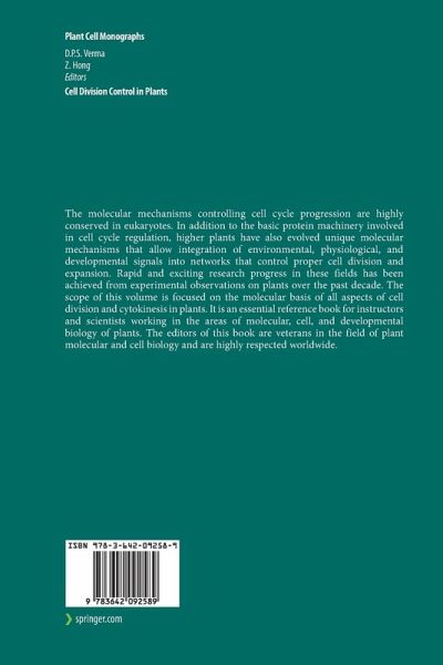 Commitment for Cell Division and Cell Cycle Control.- Circadian Regulation of Cell Division.- Transcriptional Control of the Plant Cell Cycle.- Division Plane Orientation in Plant Cells.- G1/S Transition and the Rb-E2F Pathway.- The Endoreduplication Cell Cycle: Regulation and Function.- Dynamics of Chromosomes, Cytoskeleton and Organelles During Cell Division.- Chromosome Dynamics in Meiosis.- Cytoskeletal and Vacuolar Dynamics During Plant Cell Division: Approaches Using Structure-Visualized Cells.- Mitotic Spindle Assembly and Function.- Cytoskeletal Motor Proteins in Plant Cell Division.- Organelle Dynamics During Cell Division.- Open Mitosis: Nuclear Envelope Dynamics.- Cell Plate Formation and Cytokinesis.- MAP Kinase Signaling During M Phase Progression.- Plant Cytokinesis - Insights Gained from Electron Tomography Studies.- Vesicle Traffic at Cytokinesis.- Molecular Analysis of the Cell Plate Forming Machinery.- Cell Division and Differentiation.- Asymmetric Cell Divisions: Zygotes of Fucoid Algae as a Model System.- Stomatal Patterning and Guard Cell Differentiation.- Genetic Control of Anther Cell Division and Differentiation.- Coordination of Cell Division and Differentiation.
