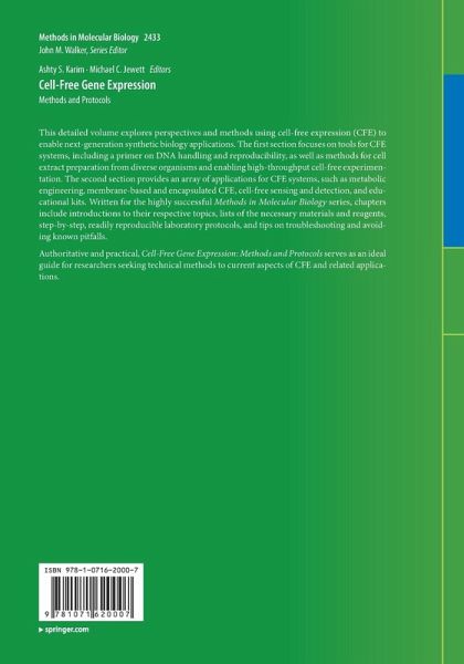 Best Practices for DNA Template Preparation towards Improved Reproducibility in Cell-Free Protein Production.- Simple Extract Preparation Methods for E. coli-Based Cell-Free Expression.- Preparation and Screening of Cell-Free Extract from Non-Growing Escherichia coli A19Cells.- Cell-Free Protein Synthesis Using Pichia pastoris.- A Streptomyces-Based Cell-Free Protein Synthesis System for High-Level Protein Expression.- In Vitro Reconstitution Platforms of Mammalian Cell-Free Expressed Membrane Proteins.- High-Throughput Experimentation Using Cell-Free Protein Synthesis Systems.- Cell-Free Gene Expression from DNA Brushes.- Efficient and Precise Protein Synthesis in a Cell-Free System Using a Set of In Vitro Transcribed tRNAs with Nucleotide Modifications.- Measurement of Transcription, Translation, and Other Enzymatic Processes during Cell-Free Expression Using PERSIA.- Cell-Free Noncanonical Redox Cofactor Systems.- Cell-Free Protein Synthesis forHigh-Throughput Biosynthetic Pathway Prototyping.- Metabolomics Analysis of Cell-Free Expression Systems Using Gas Chromatography-Mass Spectrometry.- Liposome Preparation by 3D-Printed Microcapillary-Based Apparatus.- Microfluidic Production of Porous Polymer Cell-Mimics Capable of Gene Expression.- Cell-Free Membrane Protein Expression into Hybrid Lipid/Polymer Vesicles.- Cell-Free Synthesis Strategies to Probe Co-Translational Folding of Proteins within Lipid Membranes.- Assembly of RNA Nanostructures from Double Crossover Tiles.- Cell-Free Biosensors and AI Integration.- ROSALIND: Rapid Detection of Chemical Contaminants with In Vitro Transcription Factor-Based Biosensors.- Optical Sensing in Cell-Free Expression.- Cell-Free Paper-Based Analysis of Gut Microbiota and Host Biomarkers.- Detection of Norovirus Using Paper-Based Cell-Free Systems.- A TXTL-Based Assay to Rapidly Identify PAMs for CRISPR-Cas Systems with Multi-Protein Effector Complexes.- Implementing Hands-On Molecular and Synthetic Biology Education Using Cell-Free Technology.