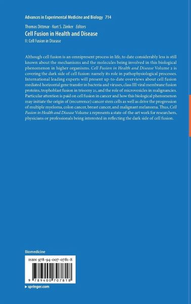 Although cell fusion is an omnipresent process in life, to date considerably less is still known about the mechanisms and the molecules being involved in this biological phenomenon in higher organisms. In Cell Fusion in Health and Disease Vol 1 & Vol 2 leading experts will present up-to-date overviews about cell fusion in physiological and patho-physiological processes, which further covers the current knowledge about cell fusion-mediating molecules. Volume 1 deals with Cell Fusion in Health and will cover aspects of cell fusion in fertilization, placentation, in C. elegans, in skeletal muscle development and tissue repair, and the use of cell fusion for cellular reprogramming and cancer vaccine development. Volume 2 focuses on Cell Fusion in Disease with a particular emphasis on the role of cell fusion in cancer development and progression. Thus, Cell Fusion in Health and Disease Vol 1 & Vol 2 represents a state-of-the-art work for researchers, physicians or professionals being interested in the biological phenomenon of cell fusion and beyond.
