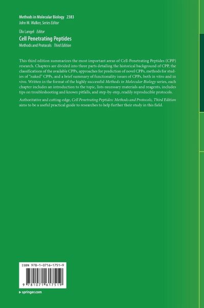 Cell-penetrating peptides.- Shuttling homeoproteins and their biological significance.- Artificial evolutionary optimization process to improve the functionality of CPPs.- In silico design of chemically modified cell penetrating peptides.- Synthetic Molecular Evolution of Cell Penetrating Peptides.- A native CPP from rattlesnake with therapeutic and theranostic properties.- Synthesis of cell-penetrating peptide coated silica nanoparticles and their physicochemical and biological characterization.- Enhancing the therapeutic potential of extracellular vesicles using peptide technology.- Challenges and methods for the study of CPP translocation mechanisms.- Membrane molecular interactions and induced structures of CPPs.- A single GUV method for revealing the action of cell-penetrating peptides in biomembranes.- Methods for Small-Angle Scattering Measurements on Peptiplexes of DNA with Cell-Penetrating Peptides.- Imaging CPP delivery mechanisms of oligonucleotides.- Quantitative subcellular analysis of cyclic cell-penetrating peptide EJP18 in non-adherent cells.- PepFect14: signaling and transfection.- Utilisation of cell-penetrating peptides for in vivo delivery of bioactive cargo - the effect of nanoparticle formulation.- Protein delivery by PTDs/CPPs.- Protein Delivery to Cytosol by Cell-Penetrating Peptide Bearing a Tandem Repeat Penetration-Accelerating Sequence.- Recombinant transcription factors (TFs) fused to ZEBRA minimal transduction domain (MD) for modulation of mRNA transcripts.- Protein mimicry and the design of bioactive cell penetrating peptides: The genesis of STOPSPERM bioportides.- Lipopeptide pepducins as therapeutic agents.- Delivery of Antibiotics by Cell-Penetrating Peptides to Kill Intracellular Pathogens.- CPP applications in immune modulation and disease therapy.- Cell-penetrating peptides as carriers for transepithelial drug delivery.- New tools for streamlined in vivo homing peptide identification.- Tumor targeting as new therapeutic approach.- Mitochondrial Targeting Probes, drug conjugates and gene therapeutics.- Novel brain penetrating single chain antibodies directed against 3RTau for the Treatment of Alzheimer's Disease and related Dementias.- Strategies for peptide-mediated cargo delivery to human smooth muscle cells.- Tips and Tools to Understand Direct Membrane Translocation of siRNA-Loaded WRAP-Based Nanoparticles.- Evaluating efficacy of peptide-delivered oligonucleotides using the severe Taiwanese SMA mouse model.- Development of CPP-based methods for delivery of miRNAs into the skin and airways - lessons from cell culture and mouse models.- Endpoint and kinetic approaches for assessing transfection efficacy in mammalian cell culture.- Tissue analysis of lung-targeted delivery of siRNA and plasmid DNA.- Improvement of transfection with PepFects byorganic and inorganic components.- DNA Transfer into Animal Cells Using Stearylated CPP Based Transfection Reagent.- Use of PepFect14 and siRNA for targeted gene silencing in human embryonic stem cells.- CRISPR/Cas9 plasmid delivery through the CPP: PepFect14.- Applications of CPPs in genome editing of plants.- Live Cell Genomics: Cell-specific transcriptome capture and exon-specific RNA binding protein isolation in live tissues and cells.