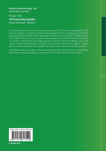 Cell-penetrating peptides.- Shuttling homeoproteins and their biological significance.- Artificial evolutionary optimization process to improve the functionality of CPPs.- In silico design of chemically modified cell penetrating peptides.- Synthetic Molecular Evolution of Cell Penetrating Peptides.- A native CPP from rattlesnake with therapeutic and theranostic properties.- Synthesis of cell-penetrating peptide coated silica nanoparticles and their physicochemical and biological characterization.- Enhancing the therapeutic potential of extracellular vesicles using peptide technology.- Challenges and methods for the study of CPP translocation mechanisms.- Membrane molecular interactions and induced structures of CPPs.- A single GUV method for revealing the action of cell-penetrating peptides in biomembranes.- Methods for Small-Angle Scattering Measurements on Peptiplexes of DNA with Cell-Penetrating Peptides.- Imaging CPP delivery mechanisms of oligonucleotides.- Quantitative subcellular analysis of cyclic cell-penetrating peptide EJP18 in non-adherent cells.- PepFect14: signaling and transfection.- Utilisation of cell-penetrating peptides for in vivo delivery of bioactive cargo - the effect of nanoparticle formulation.- Protein delivery by PTDs/CPPs.- Protein Delivery to Cytosol by Cell-Penetrating Peptide Bearing a Tandem Repeat Penetration-Accelerating Sequence.- Recombinant transcription factors (TFs) fused to ZEBRA minimal transduction domain (MD) for modulation of mRNA transcripts.- Protein mimicry and the design of bioactive cell penetrating peptides: The genesis of STOPSPERM bioportides.- Lipopeptide pepducins as therapeutic agents.- Delivery of Antibiotics by Cell-Penetrating Peptides to Kill Intracellular Pathogens.- CPP applications in immune modulation and disease therapy.- Cell-penetrating peptides as carriers for transepithelial drug delivery.- New tools for streamlined in vivo homing peptide identification.- Tumor targeting as new therapeutic approach.- Mitochondrial Targeting Probes, drug conjugates and gene therapeutics.- Novel brain penetrating single chain antibodies directed against 3RTau for the Treatment of Alzheimer's Disease and related Dementias.- Strategies for peptide-mediated cargo delivery to human smooth muscle cells.- Tips and Tools to Understand Direct Membrane Translocation of siRNA-Loaded WRAP-Based Nanoparticles.- Evaluating efficacy of peptide-delivered oligonucleotides using the severe Taiwanese SMA mouse model.- Development of CPP-based methods for delivery of miRNAs into the skin and airways - lessons from cell culture and mouse models.- Endpoint and kinetic approaches for assessing transfection efficacy in mammalian cell culture.- Tissue analysis of lung-targeted delivery of siRNA and plasmid DNA.- Improvement of transfection with PepFects byorganic and inorganic components.- DNA Transfer into Animal Cells Using Stearylated CPP Based Transfection Reagent.- Use of PepFect14 and siRNA for targeted gene silencing in human embryonic stem cells.- CRISPR/Cas9 plasmid delivery through the CPP: PepFect14.- Applications of CPPs in genome editing of plants.- Live Cell Genomics: Cell-specific transcriptome capture and exon-specific RNA binding protein isolation in live tissues and cells.