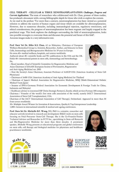 CELL THERAPY - CELLULAR & TISSUE XENOTRANSPLANTATION: Challenges, Progress and Current Applications. The team of researchers who collaborated with Dr. Chan, pioneer of these studies, has produced a document with a strong bibliographic depth for those who wish to explore the content. As we read in the preface: "For more than a century, xenotransplantation has been viewed as a potential solution to address the scarcity of human organs and tissue which are available for allotransplantation. However, due to numerous obstacles, including immunological rejection, regulatory restrictions, and ethical considerations; the progress of xenotransplantation has been stagnant and largely trapped in the preclinical stage. This book explores the challenges surrounding the field of xenotransplantation, looks into possible strategies to overcome them and discusses the potential and future of this field". Accurate images make it a very informative text. Prof. Dato' Sri Dr. Mike K.S. Chan, 62 yo Malaysian, Chairman of European Wellness Biomedical Group is a Scientist, Researcher, Author, and Educator in Stem Cells, Immunology and Bioregenerative Medicine for 39 years in Europe. He owns 40+ medical wellness, hospitals, and centres worldwide. Authored about 40+ scientific books and 90+ publications in the USA and the UK. Holds 40+ international patents in stem cells, immunology and biotechnology. He, ¿ Board member, Head of Scientific Committee for Regenerative Medicine and Asian Chairman of ESAAM (European Society of Preventative, Regenerative and Anti-Aging Medicine) est. 2003 ¿ Host the Society's Asian Chairman; Associate Professor of AASCP-USA (American Academy of Stem Cell Physicians) ¿ Chairman of A4M-USA (American Academy of Anti-Aging Medicine) for Thailand ¿ Chairman of Japan's Medical Association for Regenerative Medicine, MMJ (Multi-Dimensional Holistic Medical Team Japan) ¿ Senator of BWA-Germany (Federal Association for Economic Development & Foreign Trade for China, Indonesia and Malaysia) ¿ Healthcare advisor to renowned SSP (Swiss Strategic Partners), Zurich, which services Fortune 500 companies Chairman / Founder of the world's first stem cells association of the world, namely IASCT (International Association of Stem Cell Transplantation), USA. Chairman of the IACT (International Association of Cell Therapy), Switzerland. Appeared in more than 30 front covers worldwide. 30+ Multiple Award Winner for Invention & Innovations, Quality & Top Entrepreneur Leadership. 1,000+ lectures in international scientific & medical anti-ageing conferences. Prof. Dato Sri Dr. Michelle B.F. Wong, ND, PhD is a scientist, researcher and educator actively involved in research and development (R&D) work on stem cells focusing on Fetal Precursor Stem-Cell Therapy. She is the Co-Founder/Senior Technical Advisor and Researcher in FCTI Inc., specialising in Stem cell Research and Bio-Regenerative Medicine for more than three decades. A prominent speaker, Michelle Wong presents at educational programs and global conferences on stem cells, cell therapy and biological medicine for physicians and healthcare practitioners worldwide.