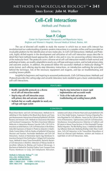Blood-Brain Barrier and Cell-Cell Interactions: Methods for Establishing In Vitro Models of the Blood-Brain Barrier and Transport Measurements.- Interactions of Intestinal Epithelial Cells With Bacteria and Immune Cells: Methods to Characterize Microflora and Functional Consequences.- The Role of Junctional Adhesion Molecules in Interactions Between Vascular Cells.- Cell-Cell Interactions on Solid Matrices.- Cell-Cell Interactions in the Kidney: Inducible Expression of Mutant G Protein ?-Subunits in Madin-Darby Canine Kidney Cells for Studies of Epithelial Cell Junction Structure and Function.- Nucleotide Metabolism and Cell-Cell Interactions.- Analysis of Mammalian Sperm-Egg Membrane Interactions During In Vitro Fertilization.- Collagen Gel Contraction Assay.- Methods to Assess Tissue Permeability.- Bacterial-Bacterial Cell Interactions in Biofilms: Detection of Polysaccharide Intercellular Adhesins by Blotting and Confocal Microscopy.- A Biochemical Method for Tracking Cholera Toxin Transport From Plasma Membrane to Golgi and Endoplasmic Reticulum.- Isolation and Culture of Murine Heart and Lung Endothelial Cells for In Vitro Model Systems.- Expression Cloning of Signaling Proteins Regulated by Cell Adhesion.- Assays for the Calcium Sensitivity of Desmosomes.- Tight Junctions and Cell-Cell Interactions.- Simultaneous Immunofluorescence Detection of Cadherin and ?-Catenin in Mouse Tissue Sections.- In Vitro Neutrophil Transepithelial Migration.- The Blot Rolling Assay: A Method for Identifying Adhesion Molecules Mediating Binding Under Shear Conditions.- Cell-Cell Interaction in the Transcellular Biosynthesis of Novel ?-3-Derived Lipid Mediators.- Isolation and Analysis of Lipid Rafts in Cell-Cell Interactions.