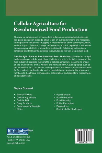 The way we produce and consume food is facing an unprecedented crisis. As the global population expands, strain is put on our food systems and resources. The agriculture industry is struggling to meet demands of the current population, and the impact of climate change, deforestation, and soil degradation are further threatening our ability to produce food sustainably. Cellular agriculture is an emerging field that has the potential to revolutionize the way we produce food. Cellular Agriculture for Revolutionized Food Production provides an in-depth understanding of cellular agriculture, its history, and its potential to transform the food industry. It explores the benefits of cellular agriculture, including its impact on the environment, animal welfare, and human health. Covering topics such as animal welfare, food production, and regulations, this book is a valuable resource for food industry professionals, environmentalists and sustainability advocates, nutritionists, healthcare professionals, policymakers and regulators, researchers, and academicians.