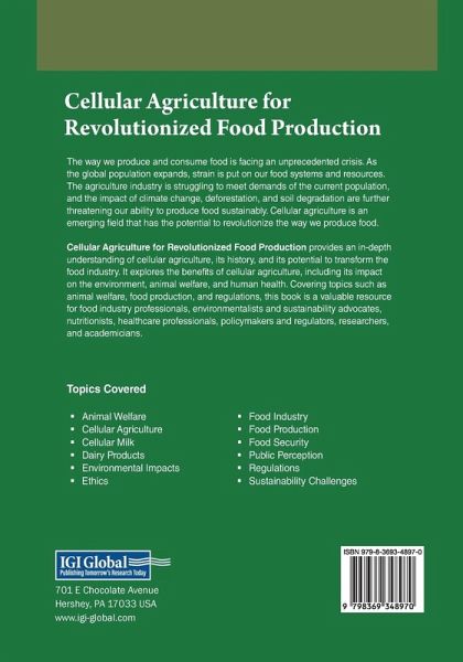The way we produce and consume food is facing an unprecedented crisis. As the global population expands, strain is put on our food systems and resources. The agriculture industry is struggling to meet demands of the current population, and the impact of climate change, deforestation, and soil degradation are further threatening our ability to produce food sustainably. Cellular agriculture is an emerging field that has the potential to revolutionize the way we produce food. Cellular Agriculture for Revolutionized Food Production provides an in-depth understanding of cellular agriculture, its history, and its potential to transform the food industry. It explores the benefits of cellular agriculture, including its impact on the environment, animal welfare, and human health. Covering topics such as animal welfare, food production, and regulations, this book is a valuable resource for food industry professionals, environmentalists and sustainability advocates, nutritionists, healthcare professionals, policymakers and regulators, researchers, and academicians.