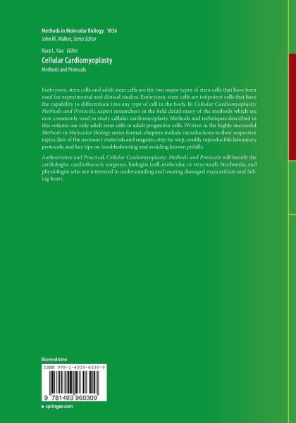 Embryonic stem cells and adult stem cells are the two major types of stem cells that have been used for experimental and clinical studies. Embryonic stem cells are totipotent cells that have the capability to differentiate into any type of cell in the body. In Cellular Cardiomyoplasty: Methods and Protocols, expert researchers in the field detail many of the methods which are now commonly used to study cellular cardiomyoplasty. Methods and techniques described in this volume use only adult stem cells or adult progenitor cells.Written in the highly successful Methods in Molecular Biology series format, chapters include introductions to their respective topics, lists of the necessary materials and reagents, step-by-step, readily reproducible laboratory protocols, and key tips on troubleshooting and avoiding known pitfalls.