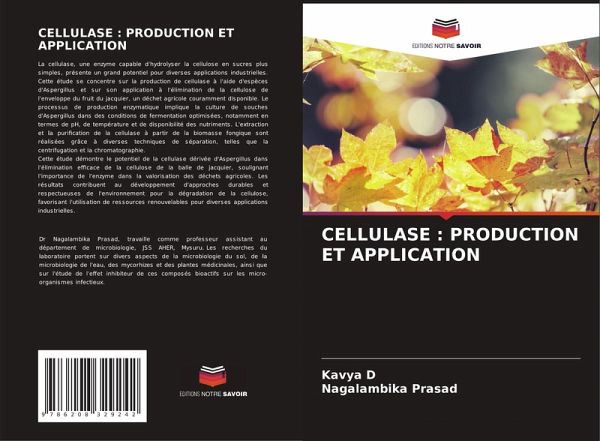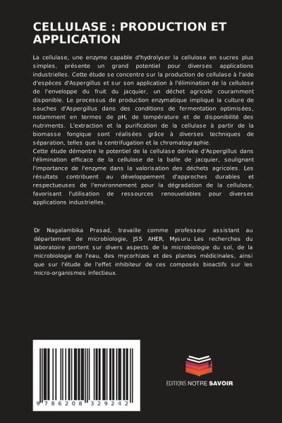 La cellulase, une enzyme capable d'hydrolyser la cellulose en sucres plus simples, présente un grand potentiel pour diverses applications industrielles. Cette étude se concentre sur la production de cellulase à l'aide d'espèces d'Aspergillus et sur son application à l'élimination de la cellulose de l'enveloppe du fruit du jacquier, un déchet agricole couramment disponible. Le processus de production enzymatique implique la culture de souches d'Aspergillus dans des conditions de fermentation optimisées, notamment en termes de pH, de température et de disponibilité des nutriments. L'extraction et la purification de la cellulase à partir de la biomasse fongique sont réalisées grâce à diverses techniques de séparation, telles que la centrifugation et la chromatographie.Cette étude démontre le potentiel de la cellulase dérivée d'Aspergillus dans l'élimination efficace de la cellulose de la balle de jacquier, soulignant l'importance de l'enzyme dans la valorisation des déchets agricoles. Les résultats contribuent au développement d'approches durables et respectueuses de l'environnement pour la dégradation de la cellulose, favorisant l'utilisation de ressources renouvelables pour diverses applications industrielles.