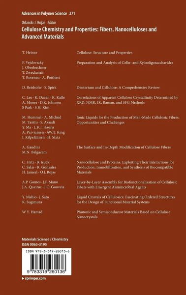Vincent Bulone et al.: Cellulose sources and new understanding of synthesis in plants Thomas Heinze et al.:Cellulose structure and properties Thomas Rosenau, Antje Potthast, Ute Henniges et al.: Recent developments in cellulose aging (degradation / yellowing / chromophore formation) Sunkyu Park et al.:Cellulose crystallinity Lina Zhang et al.:Gelation and dissolution behavior of cellulose Yoshiyuki Nishio et al.:Cellulose and derivatives in liquid crystals Alessandro Gandini, Naceur Belgacem et al.:The surface and in-depth modification of cellulose fibers Emily D. Cranston et al.:Interfacial properties of cellulose Herbert Sixta, Michael Hummel et al.Cellulose Fibers Regenerated from Cellulose Solutions in Ionic Liquids Qi Zhou et al.:Cellulose-based biocomposites Orlando Rojas et al.:Films of cellulose nanocrystals and nanofibrils Pedro Fardim et al.:Functional cellulose particles Wadood Hamad et al.:Cellulose Composites