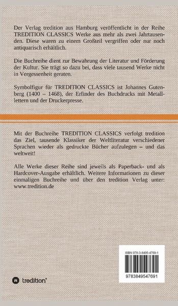 Diese Hardcover-Ausgabe ist Teil der TREDITION CLASSICS. Der Verlag tredition aus Hamburg veröffentlicht in der Buchreihe TREDITION CLASSICS Werke aus mehr als zwei Jahrtausenden. Diese waren zu einem Großteil vergriffen oder nur noch antiquarisch erhältlich. Mit TREDITION CLASSICS verfolgt tredition das Ziel, tausende Klassiker der Weltliteratur verschiedener Sprachen wieder als gedruckte Bücher zu verlegen und das weltweit! Die Buchreihe dient zur Bewahrung der Literatur und Förderung der Kultur. Sie trägt so dazu bei, dass viele tausend Werke nicht in Vergessenheit geraten.