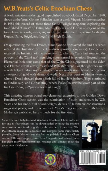 W.B. Yeats's Celtic Enochian Chess A black imitation-leather, gold unpublished notebook dated December 1898, shows us the Yeats-Gonne-Pollexfen team at work. Virginia Moore transcribes in 1954 this record of these three Celtic Twilight magicians exploring the four fabled "Cities," of Falias, Murius, Findias, and Gorias - regions of the four elements, earth, water, air, and fire - under their respective Gods (the Dagda, Danu, Brigid, and Lugh) and High Druids. On questioning the four Druids, Maud Gonne discovered she and Yeats had received the Initiation of the Cauldron (purification/water). Gonne also received the Initiation of the Stone (earth); whereas Yeats had attracted the powers of the Wand (air) signifying supernatural inspiration. Beyond these Elemental Initiations came that of the White Globe, governed by the elder-god Elathan (front cover). Yeats and Pollexfen went - or thought they went - with help of talismans to Falias, wherein a rough stone house George saw a skeleton of gold with diamond teeth. Next they went to Murias (water), where a Druid showed them a bath full of indolent bathers. Trips continued to Findias (air), and Gorias (fire), where Pollexfen saw the lower part of the fire God Aengus ("passive form of Lug"). This amazing sixteen board sub-elemental extension to the Golden Dawn Enochian Chess system was the culmination of such endeavours by W.B. Yeats and his circle. Full board designs, details of talismanic constructions, suggested pieces, and my account of Yeats's magickal feud with McGregor Mathers, is published here - much for the first time.