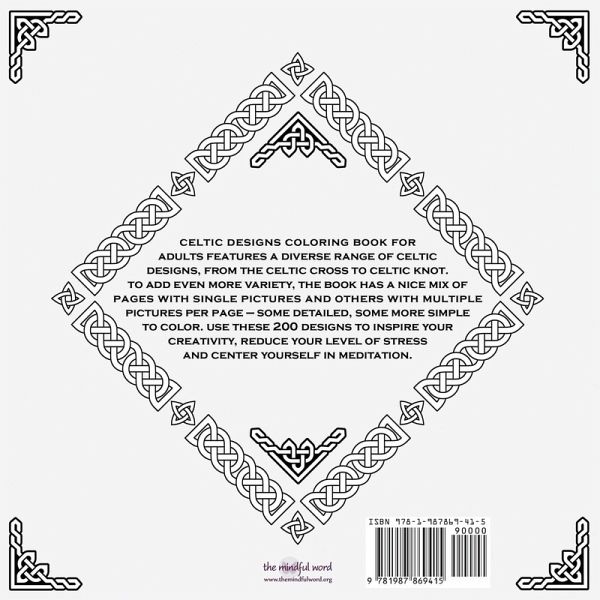 Celtic Designs Coloring Book for Adults contains a broad range of different Celtic design patterns, from the Celtic Cross to Celtic Knot (and its variations, such as the Celtic Love Knot). Use the 200 Celtic designs in this coloring book to inspire your creativity, reduce your stress levels and center yourself in meditation. This book features: 200 Celtic designs to color! Celtic Knots, Celtic Crosses and other beautiful Celtic art patterns with a mix of intricate and basic designs. Introductions to Celtic art and art therapy, written by an art therapist Designs are printed on individual sheets to reduce bleed through Some pages have one large design to a page, some have multiple smaller designs per page Bright white color paper Perfect-bound glossy softcover (10 pt)