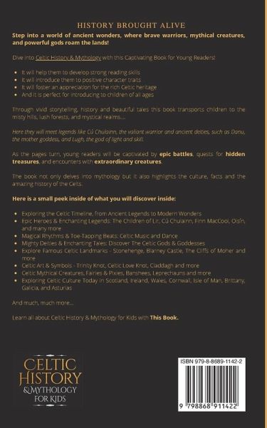 Step into a world of ancient wonders, where brave warriors, mythical creatures, and powerful gods roam the lands! Dive into Celtic History & Mythology with this Captivating Book for Young Readers!It will help them to develop strong reading skills It will introduce them to positive character traits It will foster an appreciation for the rich Celtic heritage And it is perfect for introducing to children of all ages Through vivid storytelling, history and beautiful tales this book transports children to the misty hills, lush forests, and mystical realms.... Here they will meet legends like Cú Chulainn, the valiant warrior and ancient deities, such as Danu, the mother goddess, and Lugh, the god of light and skill. As the pages turn, young readers will be captivated by epic battles, quests for hidden treasures, and encounters with extraordinary creatures. The book not only delves into mythology but it also highlights the culture, facts and the amazing history of the Celts. Here is a small peek inside of what you will discover inside:Exploring the Celtic Timeline, from Ancient Legends to Modern Wonders Epic Heroes & Enchanting Legends: The Children of Lir, Cú Chulainn, Finn MacCool, Oisín, and many more Magical Rhythms & Toe-Tapping Beats: Celtic Music and Dance Mighty Deities & Enchanting Tales: Discover The Celtic Gods & Goddesses Explore Famous Celtic Landmarks - Stonehenge, Blarney Castle, The Cliffs of Moher and more Celtic Art & Symbols - Trinity Knot, Celtic Love Knot, Claddagh and more Celtic Mythical Creatures, Fairies & Pixies, Banshees, Leprechauns and more Exploring Celtic Culture Today in Scotland, Ireland, Wales, Cornwall, Isle of Man, Brittany, Galicia, and Asturias And much, much more... Learn all about Celtic History & Mythology for Kids with This Book.