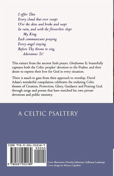 'I offer Thee Every cloud that ever swept O'er the skies and broke and wept In rain, and with the flowerlets slept. My King. Each communicant praying Every angel staying Before Thy throne to sing. Adoramus Te! This extract from the ancient Irish prayer, Glorificamus Te, beautifully captures both the Celtic peoples' devotion to the Psalter, and their desire to express their love for God in every situation. There is much to gain from their approach to worship. David Adam's wonderful compilation celebrates the enduring Celtic dreams of Creation, Protection, Glory, Guidance and Praising God, through songs and poems that have enriched his own private devotions and public ministry.