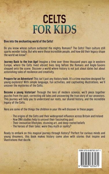 ¿¿¿¿ Dive into the enchanting world of the Celts! ¿¿¿¿ Do you know whose culture outlasted the mighty Romans? The Celts! Their culture still sparks wonder today. But who were these incredible people, and how did their legacy shape the world we know? ¿¿¿¿ Journey Back to the Iron Age! Imagine a time over three thousand years ago in Western Europe, where the Celts lived vibrant lives long before the Romans and Anglo-Saxons stepped onto the scene. Discover a world where history is not just about dates but about astonishing tales of resilience and creativity. ¿¿¿¿ Prepare for an Adventure! This isn't just any history book. It's a time machine designed for young explorers! With simple language, fun activities, and captivating illustrations, we'll uncover the mysteries of the Celts. ¿¿¿¿ Become a young historian! Through the lens of modern science, we'll piece together puzzles from the past, correcting old tales and uncovering the true story of our ancestors. This journey will help you to understand our roots, our shared history, and the incredible legacy of the Celts. Here are some of the things the children in your life will discover in these pages: The origins of the Celts and their widespread influence across Britain and Ireland How DNA studies help to unravel their fascinating past Their innovative lifestyles, stunning art, and deep-rooted beliefs The heroes of their tales: were they myth or reality? ¿¿¿¿ Ready to embark on this magical journey through history? Perfect for curious minds and young dreamers, this book makes history come alive with stories that inspire and illustrations that dazzle.