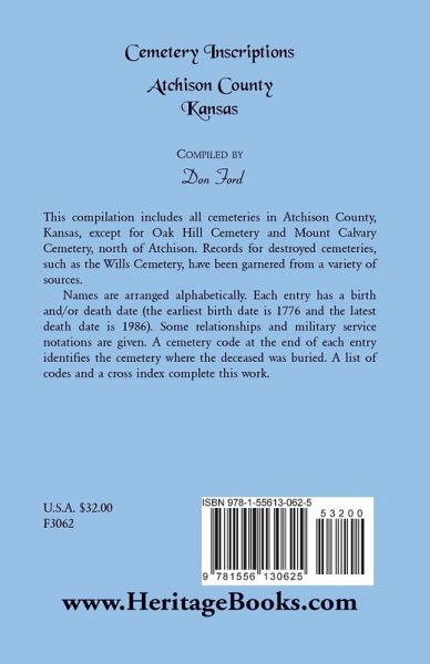 This compilation includes all cemeteries in Atchison County, Kansas, except for Oak Hill Cemetery and Mount Calvary Cemetery, north of Atchison. Records for destroyed cemeteries, such as the Wills Cemetery, have been garnered from a variety of sources. Names are arranged alphabetically. Each entry has a birth and/or death date (the earliest birth date is 1776 and the latest death date is 1986). Some relationships and military service notations are given. A cemetery code at the end of each entry identifies the cemetery where the deceased was buried. A list of codes and a cross index complete this work.