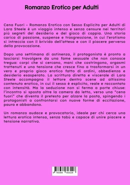 Cena Fuori - Romanzo Erotico con Sesso Esplicito per Adulti di Lara Steele è un viaggio intenso e senza censure nei territori più segreti del desiderio e del gioco di coppia. Una storia carica di passione, suspense e trasgressione, in cui l'erotismo si intreccia con il brivido dell'attesa e con il piacere perverso della provocazione.Dopo una settimana di astinenza, il protagonista è pronto a lasciarsi travolgere da una fame sessuale che non conosce tregua: corpi che si cercano, mani che costringono, orgasmi trattenuti e una tensione che cresce fino a trasformarsi in un vero e proprio gioco erotico fatto di ordini, obbedienza e desiderio esasperato. La scrittura diretta e viscerale di Lara Steele accompagna il lettore dentro scene ad altissimo contenuto erotico, in cui il sesso è esplicito, reale e raccontato con intensità. Ma la seduzione non si ferma a porte chiuse: l'incontro si sposta oltre la camera da letto, verso una "cena fuori" che diventa il pretesto per alzare la posta,spingendo i protagonisti a confrontarsi con nuove forme di eccitazione, paura e abbandono.Un romanzo audace e provocatorio, ideale per chi cerca una lettura erotica intensa, senza tabù e capace di unire piacere e tensione narrativa.