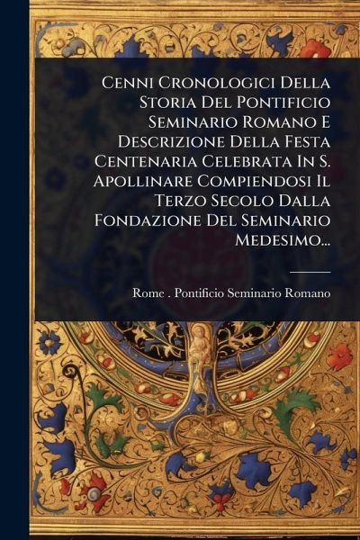 Cenni Cronologici Della Storia Del Pontificio Seminario Romano E Descrizione Della Festa Centenaria Celebrata In S. Apollinare Compiendosi Il Terzo Secolo Dalla Fondazione del Seminario Medesimo... offers a detailed chronological overview of the history of the Pontificio Seminario Romano (Pontifical Roman Seminary). This historical account, originally published to commemorate the centenary celebrations held in S. Apollinare, marks the third century since the Seminary's founding. The book provides insights into the Seminary's development, its role within the Catholic Church, and its significance to the city of Rome. It serves as a valuable resource for those interested in the history of Catholic education, the evolution of religious institutions in Italy, and the broader context of ecclesiastical history. It captures a moment in time, celebrating the Pontificio Seminario Romanoâ(TM)s rich heritage and enduring contributions. This work has been selected by scholars as being culturally important, and is part of the knowledge base of civilization as we know it. This work was reproduced from the original artifact, and remains as true to the original work as possible. Therefore, you will see the original copyright references, library stamps (as most of these works have been housed in our most important libraries around the world), and other notations in the work. This work is in the public domain in the United States of America, and possibly other nations. Within the United States, you may freely copy and distribute this work, as no entity (individual or corporate) has a copyright on the body of the work. As a reproduction of a historical artifact, this work may contain missing or blurred pages, poor pictures, errant marks, etc. Scholars believe, and we concur, that this work is important enough to be preserved, reproduced, and made generally available to the public. We appreciate your support of the preservation process, and thank you for being an important part of keeping this knowledge alive and relevant.