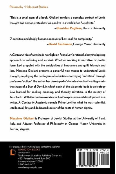 In A Centaur in Auschwitz, Massimo Giuliani sheds new light on Primo Levi's rational, demythologizing approach to suffering and survival. Whether working in narrative or poetic form, Levi grappled with the ambiguities and complexities of innocence and guilt, triumph and loss. Giuliani presents a powerful new means to understand Levi's thought: employing the neologism of salvaction (conveying "salvation" through one's own "action"), Giuliani has developed a "star of salvaction"-a diagram in the shape of a star of David, in which each of the six points leads to a strategy Levi learned for seeking meaning, and thereby salvation, in the misery of Auschwitz. This unique book, with its concise overview of Levi's expression and development as a writer, reveals Primo Levi for what he was: scientist, intellectual, Jew, and dedicated seeker of the roots of human dignity.