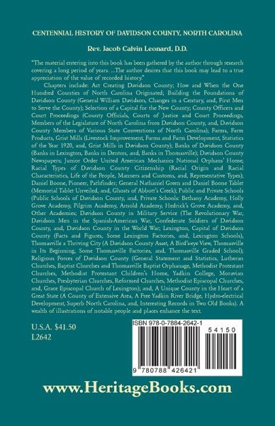 "The material entering into this book has been gathered by the author through research covering a long period of years. ...The author desires that this book may lead to a true appreciation of the value of recorded history." Chapters include: Act Creating Davidson County; How and When the One Hundred Counties of North Carolina Originated; Building the Foundations of Davidson County (General William Davidson, Changes in a Century, and, First Men to Serve the County); Selection of a Capital for the New County; County Officers and Court Proceedings (County Officials, Courts of Justice and Court Proceedings, Members of the Legislature of North Carolina from Davidson County, and, Davidson County Members of Various State Conventions of North Carolina); Farms, Farm Products, Grist Mills (Livestock Improvement, Farms and Farm Development, Statistics of the Year 1920, and, Grist Mills in Davidson County); Banks of Davidson County (Banks in Lexington, Banks in Denton, and, Banks in Thomasville); Davidson County Newspapers; Junior Order United American Mechanics National Orphans' Home; Racial Types of Davidson County Citizenship (Racial Origin and Racial Characteristics, Life of the People, Manners and Customs, and, Representative Types); Daniel Boone, Pioneer, Pathfinder; General Nathaniel Green and Daniel Boone Tablet (Memorial Tablet Unveiled, and, Ghosts of Abbott's Creek); Public and Private Schools (Public Schools of Davidson County, and, Private Schools: Bethany Academy, Holly Grove Academy, Pilgrim Academy, Arnold Academy, Hedrick's Grove Academy, and, Other Academies; Davidson County in Military Service (The Revolutionary War, Davidson Men in the Spanish-American War, Confederate Soldiers of Davidson County, and, Davidson County in the World War; Lexington, Capital of Davidson County (Facts and Figures, Some Lexington Factories, and, Lexington Schools), Thomasville a Thriving City (A Davidson County Asset, A Bird's-eye View, Thomasville in Its Beginning, Some Thomasville Factories, and, Thomasville Graded School); Religious Forces of Davidson County (General Statement and Statistics, Lutheran Churches, Baptist Churches and Thomasville Baptist Orphanage, Methodist Protestant Churches, Methodist Protestant Children's Home, Yadkin College, Moravian Churches, Presbyterian Churches, Reformed Churches, Methodist Episcopal Churches, and, Grace Episcopal Church of Lexington); and, A Unique County in the Heart of a Great State (A County of Extensive Area, A Free Yadkin River Bridge, Hydro-electrical Development, Superb North Carolina, and, Interesting Records in Two Old Books). A wealth of illustrations of notable people and places enhance the text.