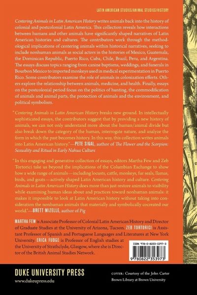 Centering Animals in Latin American History writes animals back into the history of colonial and postcolonial Latin America. This collection reveals how interactions between humans and other animals have significantly shaped narratives of Latin American histories and cultures. The contributors work through the methodological implications of centering animals within historical narratives, seeking to include nonhuman animals as social actors in the histories of Mexico, Guatemala, the Dominican Republic, Puerto Rico, Cuba, Chile, Brazil, Peru, and Argentina. The essays discuss topics ranging from canine baptisms, weddings, and funerals in Bourbon Mexico to imported monkeys used in medical experimentation in Puerto Rico. Some contributors examine the role of animals in colonization efforts. Others explore the relationship between animals, medicine, and health. Finally, essays on the postcolonial period focus on the politics of hunting, the commodification of animals and animal parts, the protection of animals and the environment, and political symbolism. Contributors. Neel Ahuja, Lauren Derby, Regina Horta Duarte, Martha Few, Erica Fudge, León García Garagarza, Reinaldo Funes Monzote, Heather L. McCrea, John Soluri, Zeb Tortorici, Adam Warren, Neil L. Whitehead