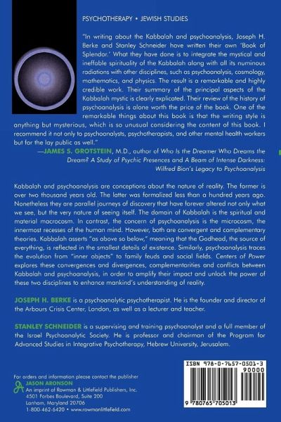 This extraordinary book is an attempt to determine man's place in the world, spiritually and metapsychologically, by exploring two disciplines - psychoanalysis and Kabbalah. Joseph Berke and Stanley Schneider, two world-renowned psychoanalysts and authors, attempt to build a bridge between these disciplines which deal with the nature of man's existence and the various forces that affect his life. The erudite interlocution between the multilayered conceptualizations of psychoanalysis and the rich mystical thinking of Kabbalah, sprinkled with moving clinical vignettes from the world of therapy and with marvelous Hassidic tales and anecdotes, makes it an academic achievement as well as a fascinating journey into man's psychic and spiritual world. I highly recommend this book for its originality and scholarship, and for its readability and clarity of exposition. -- Ilany Kogan, training analyst, Israel Psychoanalytic Society The relationship between the self and the soul, as well as higher influences on a physical and meta-physical plain, are of fundamental importance for achieving an understanding of ourselves and our place in the world. In this remarkable study Dr. Joseph Berke and Professor Stanley Schneider show how much Jewish mystical concepts, as reflected in Kabbalah and Hasidic thought, are deeply intertwined with psychoanalysis and contemporary culture. The book invites us to explore new, elevated and more sophisticated levels of awareness of different dimensions of reality. Everyone, regardless of their religiosity, should make it a priority to read this book. In so doing they will greatly enrich the spiritual and psychological structure of their lives... -- Rabbi Dr. Nathan Lopes Cardozo, founder and dean, the David Cardozo Academy, Jerusalem In this fascinating work two leading figures in the world of psychotherapy take us on a journey of discovery, beyond some of the conventional paradigms of our time. Most of these paradigms concern borders: the border and imagined division between scientific rationalism and spiritual experience, between secular modernism and religious traditions, between western culture and ancient Hebrew texts. Centers of Power deconstructs these borders and demonstrates parallels and interconnections at every step. Like an up-to-date form of Renaissance scholarship, on any page you might find a reference to the Zohar, to Freud or Jung, to Einstein, to the Talmud and a Chassidic story. The centers of the power in the title refer to the center point of a person, of a level of being, of a way of looking at the world, of a scientific system, of a level of mystical tradition, of a journey. According to Rabbi Shneur Zalman's Tanya, the central point of every level of being is Truth. All points of Truth join together reaching above to the Infinite and below to the lowest level of existence. The theory of the authors is that if you can locate the point of Truth in psychoanalysis, in contemporary culture, in yourself, and in life, then, since all levels of Truth in -- Tali Loewenthal, director, Chabad Research Unit, London Schneider and Berke have succeeded in drawing together two disciplines in a manner so skillful that it makes one wonder why these powerful connections have not been made before. It is a tribute to their scholarship and humanity that they have achieved this. Anyone concerned with healing and self-knowledge will benefit from reading this book. -- Paul Williams, joint editor-in-chief, International Journal of Psychoanalysis 2001-2007 Drs. Berke and Schneider have managed to show convincingly how basic concepts of psychoanalysis and Kabbalistic thinking overlap and deal-within different theoretical perspectives, with fundamental problems of the human psyche, in health and illness.While scholarly reviewing central aspects of both disciplines in close comparative analyses, they are able to provide the psychoanalyst with a clear and comprehensive understanding of the Kabbalah for the modern mind. By the same token, they convey a clear and profound summary of contemporary psychoanalytic understanding to the expert in the Kabbalah. By the same process, the educated layman may acquire an intelligent, thoughtful introduction to the relationship between psychotherapeutic thinking andthe spiritual dimension of an important field of Jewish religion. It is an important, thought-provoking contribution to the very actual discussion of the encounter of religion and psychological science in the light of our present knowledge of the unconscious determinants of behavior. -- Otto F. Kernberg, MD, author of Love and Aggression In writing about the Kabbalah and Psychoanalysis, the authors have written their own "Book of Splendor." What they have done is to integrate the mystical and ineffable spirituality of the Kabbalah along with all its numinous radiations, with other disciplines, such as psychoanalysis, cosmology, mathematics and physics. the result is a remarkable and highly credible work. Their summary of the principle aspects of the Kabbalah mystic are clearly explicated. Their review of the history of psychoanalysis is alone worth the price of the book. They state the following: "The dual influence theory in psychoanalysis comes closest to paralleling the dual influence theory of the Kabbalah. So, the dictum 'as above, so below,' becomes 'as below, so above.' One of the remarkable things about this book is that the writer's writing style is anything but mysterious, which is so unusual considering the content of this book. I recommend it not only to psychoanalysts and psychotherapists and other mental health workers but for the lay public, as well. -- James S. Grotstein, M.D., author, Who Is the Dreamer Who Dreams the Dream? A Study of Psychic Presences The relationship between the self and the soul, as well as higher influences on a physical and meta-physical plain, are of fundamental importance for achieving an understanding of ourselves and our place in the wor