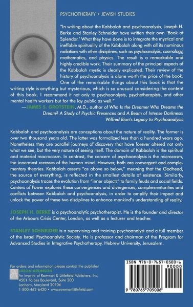 This extraordinary book is an attempt to determine man's place in the world, spiritually and metapsychologically, by exploring two disciplines - psychoanalysis and Kabbalah. Joseph Berke and Stanley Schneider, two world-renowned psychoanalysts and authors, attempt to build a bridge between these disciplines which deal with the nature of man's existence and the various forces that affect his life. The erudite interlocution between the multilayered conceptualizations of psychoanalysis and the rich mystical thinking of Kabbalah, sprinkled with moving clinical vignettes from the world of therapy and with marvelous Hassidic tales and anecdotes, makes it an academic achievement as well as a fascinating journey into man's psychic and spiritual world. I highly recommend this book for its originality and scholarship, and for its readability and clarity of exposition. -- Ilany Kogan, training analyst, Israel Psychoanalytic Society The relationship between the self and the soul, as well as higher influences on a physical and meta-physical plain, are of fundamental importance for achieving an understanding of ourselves and our place in the world. In this remarkable study Dr. Joseph Berke and Professor Stanley Schneider show how much Jewish mystical concepts, as reflected in Kabbalah and Hasidic thought, are deeply intertwined with psychoanalysis and contemporary culture. The book invites us to explore new, elevated and more sophisticated levels of awareness of different dimensions of reality. Everyone, regardless of their religiosity, should make it a priority to read this book. In so doing they will greatly enrich the spiritual and psychological structure of their lives... -- Rabbi Dr. Nathan Lopes Cardozo, founder and dean, the David Cardozo Academy, Jerusalem In this fascinating work two leading figures in the world of psychotherapy take us on a journey of discovery, beyond some of the conventional paradigms of our time. Most of these paradigms concern borders: the border and imagined division between scientific rationalism and spiritual experience, between secular modernism and religious traditions, between western culture and ancient Hebrew texts. Centers of Power deconstructs these borders and demonstrates parallels and interconnections at every step. Like an up-to-date form of Renaissance scholarship, on any page you might find a reference to the Zohar, to Freud or Jung, to Einstein, to the Talmud and a Chassidic story. The centers of the power in the title refer to the center point of a person, of a level of being, of a way of looking at the world, of a scientific system, of a level of mystical tradition, of a journey. According to Rabbi Shneur Zalman's Tanya, the central point of every level of being is Truth. All points of Truth join together reaching above to the Infinite and below to the lowest level of existence. The theory of the authors is that if you can locate the point of Truth in psychoanalysis, in contemporary culture, in yourself, and in life, then, since all levels of Truth in -- Tali Loewenthal, director, Chabad Research Unit, London Schneider and Berke have succeeded in drawing together two disciplines in a manner so skillful that it makes one wonder why these powerful connections have not been made before. It is a tribute to their scholarship and humanity that they have achieved this. Anyone concerned with healing and self-knowledge will benefit from reading this book. -- Paul Williams, joint editor-in-chief, International Journal of Psychoanalysis 2001-2007 Drs. Berke and Schneider have managed to show convincingly how basic concepts of psychoanalysis and Kabbalistic thinking overlap and deal-within different theoretical perspectives, with fundamental problems of the human psyche, in health and illness.While scholarly reviewing central aspects of both disciplines in close comparative analyses, they are able to provide the psychoanalyst with a clear and comprehensive understanding of the Kabbalah for the modern mind. By the same token, they convey a clear and profound summary of contemporary psychoanalytic understanding to the expert in the Kabbalah. By the same process, the educated layman may acquire an intelligent, thoughtful introduction to the relationship between psychotherapeutic thinking andthe spiritual dimension of an important field of Jewish religion. It is an important, thought-provoking contribution to the very actual discussion of the encounter of religion and psychological science in the light of our present knowledge of the unconscious determinants of behavior. -- Otto F. Kernberg, MD, author of Love and Aggression In writing about the Kabbalah and Psychoanalysis, the authors have written their own "Book of Splendor." What they have done is to integrate the mystical and ineffable spirituality of the Kabbalah along with all its numinous radiations, with other disciplines, such as psychoanalysis, cosmology, mathematics and physics. the result is a remarkable and highly credible work. Their summary of the principle aspects of the Kabbalah mystic are clearly explicated. Their review of the history of psychoanalysis is alone worth the price of the book. They state the following: "The dual influence theory in psychoanalysis comes closest to paralleling the dual influence theory of the Kabbalah. So, the dictum 'as above, so below,' becomes 'as below, so above.' One of the remarkable things about this book is that the writer's writing style is anything but mysterious, which is so unusual considering the content of this book. I recommend it not only to psychoanalysts and psychotherapists and other mental health workers but for the lay public, as well. -- James S. Grotstein, M.D., author, Who Is the Dreamer Who Dreams the Dream? A Study of Psychic Presences The relationship between the self and the soul, as well as higher influences on a physical and meta-physical plain, are of fundamental importance for achieving an understanding of ourselves and our place in the wor