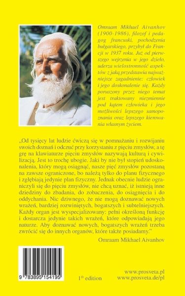 "Od tysiecy lat ludzie cwicza sie w pomnazaniu i rozwijaniu swoich doznan i odczuc przy korzystaniu z pieciu zmyslów, a te gre na klawiaturze pieciu zmyslów nazywaja kultura i cywilizacja. Jest to troche ubogie. Jaki by nie byl stopien udoskonalenia, który moga osiagnac, nasze piec zmyslów pozostana na zawsze ograniczone, bo naleza tylko do planu fizycznego i zglebiaja jedynie plan fizyczny. Jednak obecnie ludzie ograniczyli sie do pieciu zmyslów, nie chca uznac, iz istnieja inne dziedziny do zbadania, do zobaczenia, do osiagniecia i do oddychania. Nic dziwnego, ze nie moga doznawac nowych wrazen, bardziej rozwinietych, bogatszych i subtelniejszych. Kazdy organ jest wyspecjalizowany: pelni okreslona funkcje i dostarcza jedynie takich wrazen, które odpowiadaja jego naturze. Aby doznawac nowych, bogatszych wrazen trzeba zwrócic sie do innych organów, które takze posiadamy." Omraam Mikhael Aivanhov (W ksiazce wszystkie polskie litery specjalne sa poprawnie przedstawione.)