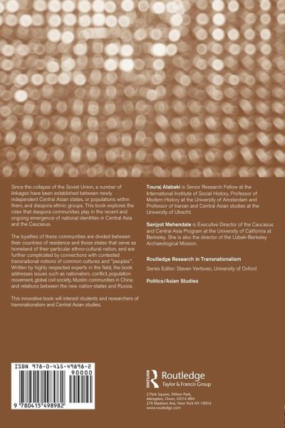Since the collapse of the Soviet Union, a number of linkages have been established between newly independent Central Asian states, or populations within them, and diaspora ethnic groups. This book explores the roles that diaspora communities play in the recent and ongoing emergence of national identities in Central Asia and the Caucasus. The loyalties of these communities are divided between their countries of residence and those states that serve as homeland of their particular ethno-cultural nation, and are further complicated by connections with contested transnational notions of common cultures and 'peoples'. Written by highly respected experts in the field, the book addresses issues such as nationalism, conflict, population movement, global civil society, Muslim communities in China and relations between the new nation-states and Russia. This innovative book will interest students and researchers of transnationalism and Central Asian studies.