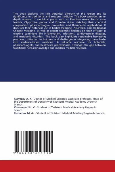 The book explores the rich botanical diversity of the region and its significance in traditional and modern medicine. The book provides an in-depth analysis of medicinal plants such as Rhodiola rosea, Ferula assa-foetida, Glycyrrhiza glabra, and Ephedra sinica, detailing their chemical composition, pharmacological properties, and therapeutic applications. It discusses their historical use in herbal medicine, Ayurveda, and Traditional Chinese Medicine, as well as recent scientific findings on their efficacy in treating conditions like inflammation, infections, cardiovascular diseases, and metabolic disorders. The book also highlights sustainable harvesting practices, cultivation techniques, and challenges in integrating these herbs into evidence-based medicine. A valuable resource for botanists, pharmacologists, and healthcare professionals, it bridges the gap between traditional herbal knowledge and modern medical research.