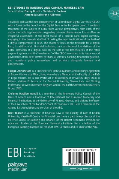 This book looks at the new phenomenon of Central Bank Digital Currency (CBDC) with a focus on the launch of the Digital Euro in the European Union. It contains treatment of the subject of CBDC from various perspectives, with each of the authors formulating viewpoints regarding this new phenomenon. It also offers an insightful assessment of the legal status of a central bank digital currency, engaging in the theoretical effort of testing the legal implications of the birth of a digital complement to cash. The chapters focus on the rationale for a digital Euro, its ability to aid financial inclusion, the constitutional foundations of the CBDC, demands of a digital euro on the side of the beneficiaries of the retail payment system, and the "mechanics" of the CBDC in relation to its issuance and governance. It will be of interest to financial services, banking, financial regulation, and monetary policy researchers and scholars alongside lawyers and policymakers.