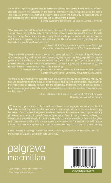 'Tognato shows well why we can not leave the study of money to economists. Money has not just economic meaning but also deep political and cultural significance. His analysis of the importance of stability cultures for the legitimacy and functioning of central banks is both fascinating and extremely timely for anyone interested in the political management of modern money.' - Eric Helleiner, CIGI Chair in International Political Economy, University of Waterloo, Canada
