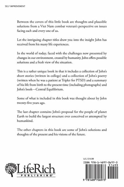 Between the covers of this little book are thoughts and plausible solutions from a Viet Nam combat veteran's perspective on issues facing each and every one of us. Let the intriguing chapter titles draw you into the insight John has received from his many life experiences. In the world of today, faced with the challenges now presented by changes in our environment, created by humanity, John offers possible solutions and a fresh view of the situation. This is a rather unique book in that it includes a collection of John's short stories (written in college) and a collection of John's poetry (written when he was a patient at Tripler for PTSD) and a summary of his life from birth to the present time (including photographs) and John's book-Central Equilibrium. Some of what is included in this book was thought about by John twenty-five years ago. The last chapter contains John's proposal for the people of planet Earth to build the largest structure ever conceived or attempted by humankind. The other chapters in this book are some of John's solutions and thoughts of the present and his visions of the future.