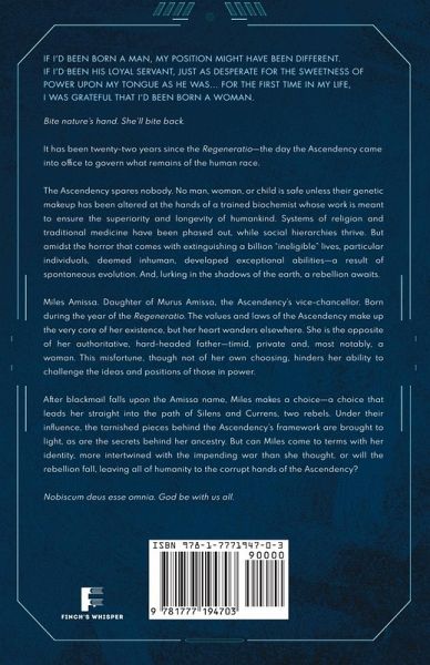 Bite nature's hand. She'll bite back. It has been twenty-two years since the Regeneratio-the day the Ascendency came into office to govern what remains of the human race. The Ascendency spares nobody. No man, woman, or child is safe unless their genetic makeup has been altered at the hands of a trained biochemist whose work is meant to ensure the superiority and longevity of humankind. Systems of religion and traditional medicine have been phased out, while social hierarchies thrive. But amidst the horror that comes with extinguishing a billion "ineligible" lives, particular individuals, deemed inhuman, developed exceptional abilities-a result of spontaneous evolution. And, lurking in the shadows of the earth, a rebellion awaits. Miles Amissa. Daughter of Murus Amissa, the Ascendency's vice-chancellor. Born during the year of the Regeneratio. The values and laws of the Ascendency make up the very core of her existence, but her heart wanders elsewhere. She is the opposite of her authoritative, hard-headed father-timid, private and, most notably, a woman. This misfortune, though not of her own choosing, hinders her ability to challenge the ideas and positions of those in power. After blackmail falls upon the Amissa name, Miles makes a choice-a choice that leads her straight into the path of Silens and Currens, two rebels. Under their influence, the tarnished pieces behind the Ascendency's framework are brought to light, as are the secrets behind her ancestry. But can Miles come to terms with her identity, more intertwined with the impending war than she thought, or will the rebellion fall, leaving all of humanity to the corrupt hands of the Ascendency? Nobiscum deus esse omnia. God be with us all.