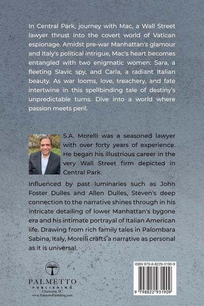 In Central Park, Steven Morelli masterfully interweaves history and romance, transporting readers from bustling pre-war New York to the politically charged corridors of the Vatican. Tommy McCabe Martin, affectionately known as "Mac", is unexpectedly plucked from his Wall Street law firm's polished floors and thrust into the world of international espionage. As a counsel to the Vatican, Mac's descriptive reports about Italy, its people, and their sentiments towards Fascism and America earn the attention of President Roosevelt. Yet amidst the political tension, Mac's heart is ensnared by two women: the mysterious Slavic spy, Sara, who vanishes as swiftly as she appears, and the enchanting Italian belle, Carla, whom he weds in a ceremony worthy of royalty. As Mac's world is further embroiled in the war's turmoil, their lives take unexpected turns, from the glitzy world of Broadway to the dangerous frontlines in Sicily. With vivid portrayals of iconic settings like the Brooklyn Navy Yard, Little Italy, and the glamorous steamship journeys across the Atlantic, Morelli paints an immersive tapestry of love, betrayal, and destiny.