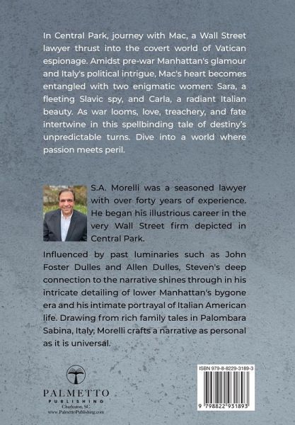 In Central Park, Steven Morelli masterfully interweaves history and romance, transporting readers from bustling pre-war New York to the politically charged corridors of the Vatican. Tommy McCabe Martin, affectionately known as "Mac", is unexpectedly plucked from his Wall Street law firm's polished floors and thrust into the world of international espionage. As a counsel to the Vatican, Mac's descriptive reports about Italy, its people, and their sentiments towards Fascism and America earn the attention of President Roosevelt. Yet amidst the political tension, Mac's heart is ensnared by two women: the mysterious Slavic spy, Sara, who vanishes as swiftly as she appears, and the enchanting Italian belle, Carla, whom he weds in a ceremony worthy of royalty. As Mac's world is further embroiled in the war's turmoil, their lives take unexpected turns, from the glitzy world of Broadway to the dangerous frontlines in Sicily. With vivid portrayals of iconic settings like the Brooklyn Navy Yard, Little Italy, and the glamorous steamship journeys across the Atlantic, Morelli paints an immersive tapestry of love, betrayal, and destiny.