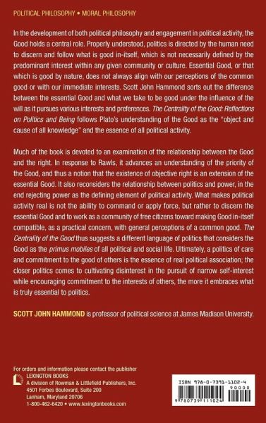 In the development of both political philosophy and engagement in political activity, the Good holds a central role. Properly understood, politics is directed by the human need to discern and follow what is good in-itself, which is not necessarily defined by the predominant interest within any given community or culture. Essential good, or that which is good by nature, does not always align with our perceptions of the common good or with our immediate interests. Scott John Hammond sorts out the difference between essential Good and what we take to be good under the influence of the will as it pursues various interests and preferences. The Centrality of the Good: Reflections on Politics and Being follows Plato's understanding of the Good as the "object and cause of all knowledge" and the essence of all political activity. Much of the book is devoted to an examination of the relationship between the good and the right. In response to Rawls, it advances an understanding of the priority of the Good, and thus a notion that the existence of objective right is an extension of the essential good. It also reconsiders the relationship between politics and power, in the end rejecting power as the defining element of political activity. What makes political activity real is not the ability to command or apply force, but rather to discern the essential good and to work as a community of free citizens toward making Good in itself compatible, as a practical concern, with general perceptions of a common good. The Centrality of the Good thus suggests a different language of politics that considers the Good as the primus mobiles of all political and social life. Ultimately, a politics of care and commitment to the good of others is the essence of real political association; the closer politics comes to cultivating disinterest in the pursuit of narrow self-interest while encouraging commitment in the interests of others, the more it embraces what is truly essential to politics.