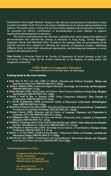 This book is contextualized in the literature on globalization, and examines how policies of decentralization have affected the running of education in Hong Kong, Taiwan, Shanghai, Singapore, Macau and Mainland China. It analyzes the strategies that the governments of the selected societies have adopted in reforming the structure of education systems, mobilizing different forces to create more educational opportunities, and devising new measures to assure quality in the education sector.