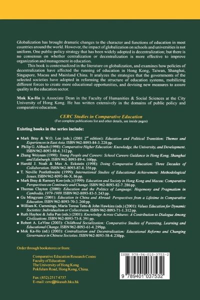 This book is contextualized in the literature on globalization, and examines how policies of decentralization have affected the running of education in Hong Kong, Taiwan, Shanghai, Singapore, Macau and Mainland China. It analyzes the strategies that the governments of the selected societies have adopted in reforming the structure of education systems, mobilizing different forces to create more educational opportunities, and devising new measures to assure quality in the education sector.