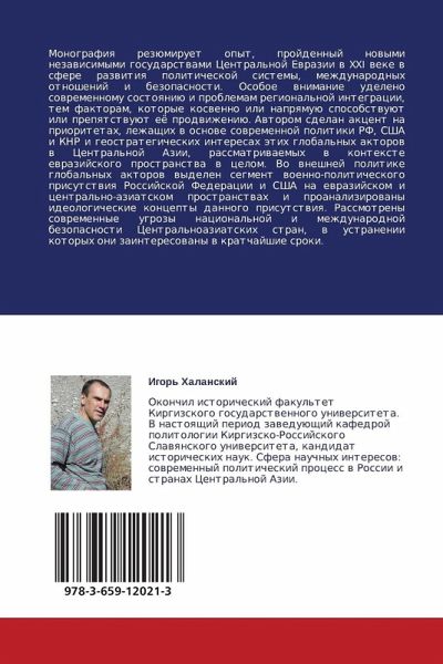 Monografiya rezjumiruet opyt, projdennyj novymi nezavisimymi gosudarstvami Central'noj Evrazii v XXI veke v sfere razvitiya politicheskoj sistemy, mezhdunarodnyh otnoshenij i bezopasnosti. Osoboe vnimanie udeleno sovremennomu sostoyaniju i problemam regional'noj integracii, tem faktoram, kotorye kosvenno ili napryamuju sposobstvujut ili prepyatstvujut ejo prodvizheniju. Avtorom sdelan akcent na prioritetah, lezhashhih v osnove sovremennoj politiki RF, SShA i KNR i geostrategicheskih interesah jetih global'nyh aktorov v Central'noj Azii, rassmatrivaemyh v kontexte evrazijskogo prostranstva v celom. Vo vneshnej politike global'nyh aktorov vydelen segment voenno-politicheskogo prisutstviya Rossijskoj Federacii i SShA na evrazijskom i central'no-aziatskom prostranstvah i proanalizirovany ideologicheskie koncepty dannogo prisutstviya. Rassmotreny sovremennye ugrozy nacional'noj i mezhdunarodnoj bezopasnosti Central'noaziatskih stran, v ustranenii kotoryh oni zainteresovany v kratchajshie sroki.