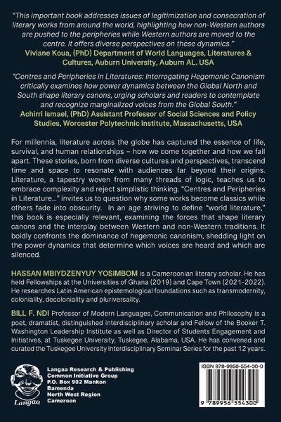 For millennia, literature across the globe has captured the essence of life, survival, and human relationships - how we come together and how we fall apart. These stories, born from diverse cultures and perspectives, transcend time and space to resonate with audiences far beyond their origins. Literature, a tapestry woven from many threads of logic, teaches us to embrace complexity and reject simplistic thinking. "Centres and Peripheries in Literature..." invites us to question why some works become classics while others fade into obscurity. In an age striving to define "world literature," this book is especially relevant, examining the forces that shape literary canons and the interplay between Western and non- Western traditions. It boldly confronts the dominance of hegemonic canonism, shedding light on the power dynamics that determine which voices are heard and which are silenced. "This important book addresses issues of legitimization and consecration of literary works from around the world, highlighting how non-Western authors are pushed to the peripheries while Western authors are moved to the centre. It offers diverse perspectives on these dynamics." Viviane Koua, (PhD) Department of World Languages, Literatures & Cultures, Auburn University, Auburn AL. USA. "Centres and Peripheries in Literatures: Interrogating Hegemonic Canonism critically examines how power dynamics between the Global North and South shape literary canons, urging scholars and readers to contemplate and recognize marginalized voices from the Global South." Achirri Ismael, (PhD) Assistant Professor of Social Sciences and Policy Studies, Worcester Polytechnic Institute, Massachusetts, USA.