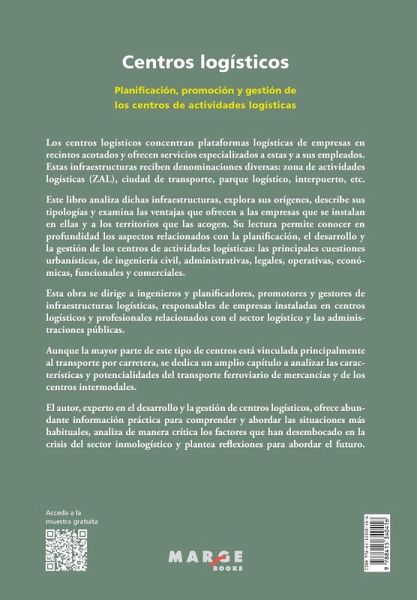 Los centros logísticos concentran plataformas logísticas de empresas en recintos acotados y ofrecen servicios especializados a estas y a sus empleados. Estas infraestructuras reciben denominaciones diversas: zona de actividades logísticas (ZAL), ciudad de transporte, parque logístico, interpuerto, etc. Este libro analiza dichas infraestructuras, explora sus orígenes, describe sus tipologías y examina las ventajas que ofrecen a las empresas que se instalan en ellas y a los territorios que las acogen. Su lectura permite conocer en profundidad los aspectos relacionados con la planificación, el desarrollo y la gestión de los centros de actividades logísticas: las principales cuestiones urbanísticas, de ingeniería civil, administrativas, legales, operativas, económicas, funcionales y comerciales. Esta obra se dirige a ingenieros y planificadores, promotores y gestores de infraestructuras logísticas, responsables de empresas instaladas en centros logísticos y profesionales relacionados con el sector logístico y las administraciones públicas. Aunque la mayor parte de este tipo de centros está vinculada principalmente al transporte por carretera, se dedica un amplio capítulo a analizar las características y potencialidades del transporte ferroviario de mercancías y de los centros intermodales. El autor, experto en el desarrollo y la gestión de centros logísticos, ofrece abundante información práctica para comprender y abordar las situaciones más habituales, analiza de manera crítica los factores que han desembocado en la crisis del sector inmologístico y plantea refl exiones para abordar el futuro.