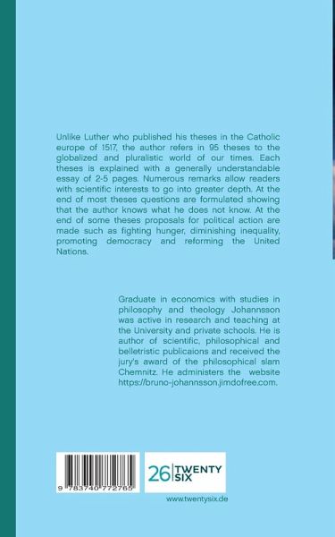 Unlike Luther who published his theses in the Catholic europe of 1517, the author refers in 95 theses to the globalized and pluralistic world of our times. Each theses is explained with a generally understandable essay of 2-5 pages. Numerous remarks allow readers with scientific interests to go into greater depth. At the end of most theses questions are formulated showing that the author knows what he does not know. At the end of some theses proposals for political action are made such as fighting hunger, diminishing inequality, promoting democracy and reforming the United Nations. Johannsson starts by outlining his conservative view of Christian Theology based on the Bible and some clarifying contributions of Joseph Smith (1806-1844). In the following ten chapters the author attempts to show the great relevance of the Christian point of view for the questions of our time. He indicates the possibility of a compromise between creationism and and the evolution paradigm. His theory of matter, spirit and soul has the potential of bringing natural and social sciences nearer to each other. Johannssons concept of Christian love proves not only to be a fundamental priciple of ethics but also of economics and political science.