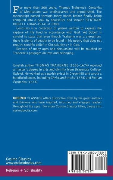 For more than 200 years, Thomas Traherne's Centuries of Meditations was undiscovered and unpublished. The manuscript passed through many hands before finally being compiled into a book by bookseller and scholar BERTRAM DOBELL (1842-1914) in 1908. Centuries is a collection of poems written to express the rapture of life lived in accordance with God. Yet Dobell is careful to state that even though Traherne was a clergyman, there is plenty of beauty to be found in his poetry that does not require specific belief in Christianity or in God. Readers of many ages and persuasions will be touched by Traherne's passages on love and belonging. English author THOMAS TRAHERNE (1636-1674) received a master's degree in arts and divinity from Brasenose College, Oxford. He worked as a parish priest in Credenhill and wrote a handful of books, including Christian Ethicks (1675) and Roman Forgeries (1673).
