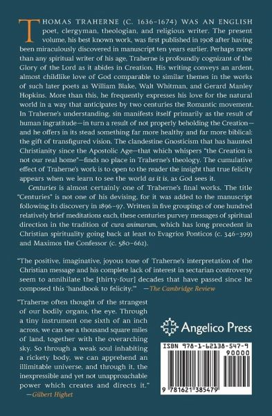 Thomas Traherne (c. 1636–1674) was an English poet, clergyman, theologian, and religious writer. The present volume is his best known work, first published in 1908 after having been rediscovered in manuscript ten years earlier. Perhaps more than any spiritual writer of his age, Traherne is profoundly cognizant of the Glory of the Lord as it abides in Creation. His writing conveys an ardent, almost childlike love of God, and is compared to similar themes in the works of later poets William Blake, Walt Whitman, and Gerard Manley Hopkins. More than this, he frequently expresses his love for the natural world in a way that anticipates by two centuries the Romantic movement. In Traherne’s understanding, sin manifests itself primarily as the result of human ingratitude—in turn a result of not properly beholding the Creation—and offers something far more healthy and far more biblical: the gift of transfigured vision. The clandestine Gnosticism that has haunted Christianity since the Apostolic Age—that which whispers "the Creation is not our real home"—finds no place in Traherne’s theology. The cumulative effect of Traherne’s work is to convince the reader that "the kingdom of heaven is within you." That is, felicity appears when we learn to see the world as it is, as God sees it. Centuries is probably one of Traherne’s final works. The name "Centuries" is not one of his devising, for that title was added to the manuscript following its discovery in 1896–97. Written in five groupings of one hundred relatively brief meditations each, the Centuries are messages of spiritual direction in the tradition of cura animarum, which has long precedent in Christian spirituality going back at least to Evagrios Ponticos (c. 346–399) and Maximos the Confessor (c. 580–662.