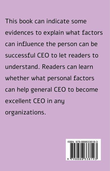 Can any one be one successful CEO? If it is not, what are the unique personal characteristics between one general CEO and one successful CEO ? Instead of personal characteristics, which kinds of skills to any successful CEOs, they will need? Why do some CEOs encounter fail to manage themselves companies? Why do some CEOs feel difficulties to manage themselves companies? This book can indicate some evidences to explain what factors can influence the person can be successful CEO to let readers to understand. Readers can learn whether what personal factors can help general CEO to become excellent CEO in any organizations.