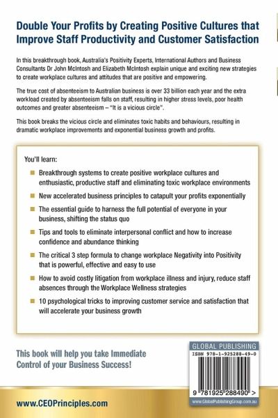 Double your profits by creating positive cultures that improve staff productivity and customer satisfaction. In this breakthrough book, Australia's positivity experts, international authors and business consultants Dr John McIntosh and Elizabeth McIntosh explain unique and exciting new strategies to create workplace cultures and attitudes that are positive and empowering. The true cost of absenteeism to Australian business is over 33 billion each year and the extra workload created by absenteeism falls on staff, resulting in higher stress levels, poor health outcomes and greater absenteeism - "It is a vicious circle." This book breaks the vicious circle and eliminates toxic habits and behaviours, resulting in dramatic workplace improvements and exponential business growth and profits. You'll learn: Breakthrough systems to create positive workplace cultures and enthusiastic, productive staff and eliminating toxic workplace environments New accelerated business principles to catapult your profits exponentially The essential guide to harness the full potential of everyone in your business, shifting the status quo Tips and tools to eliminate interpersonal conflict and how to increase confidence and abundance thinking The critical 3 step formula to change workplace negativity into positivity that is powerful, effective and easy to use How to avoid costly litigation from workplace illness and injury, reduce staff absences through the workplace wellness strategies 10 psychological tricks to improving customer service and satisfaction that will accelerate your business growth. This book will help you take immediate control of your business success.