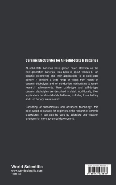 All-solid-state batteries have gained much attention as the next-generation batteries. This book is about various Li ion ceramic electrolytes and their applications to all-solid-state battery. It contains a wide range of topics from history of ceramic electrolytes and ion conduction mechanisms to recent research achievements. Here oxide-type and sulfide-type ceramic electrolytes are described in detail. Additionally, their applications to all-solid-state batteries, including Li-air battery and Li-S battery, are reviewed. Consisting of fundamentals and advanced technology, this book would be suitable for beginners in the research of ceramic electrolytes; it can also be used by scientists and research engineers for more advanced development.