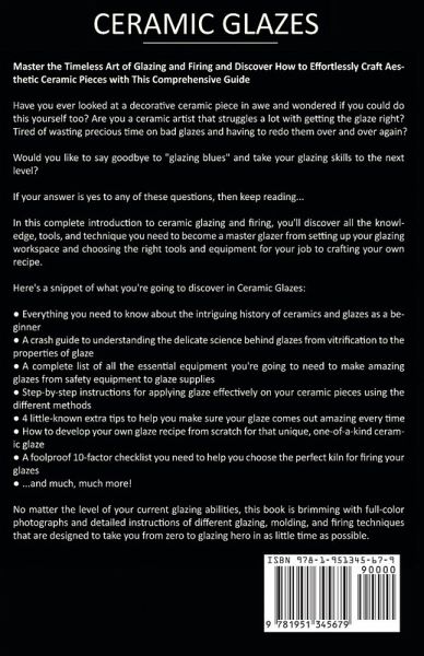 Master the Timeless Art of Glazing and Firing and Discover How to Effortlessly Craft Aesthetic Ceramic Pieces with This Comprehensive Guide Have you ever looked at a decorative ceramic piece in awe and wondered if you could do this yourself too? Are you a ceramic artist that struggles a lot with getting the glaze right? Tired of wasting precious time on bad glazes and having to redo them over and over again? Would you like to say goodbye to "glazing blues" and take your glazing skills to the next level? If your answer is yes to any of these questions, then keep reading... In this complete introduction to ceramic glazing and firing, you'll discover all the knowledge, tools and technique you need to become a master glazer from setting up your glazing workspace and choosing the right tools and equipment for your job to crafting your own recipe. Here's a snippet of what you're going to discover in Ceramic Glazes: * Everything you need to know about the intriguing history of ceramics and glazes as a beginner * A crash guide to understanding the delicate science behind glazes from vitrification to the properties of glaze * A complete list of all the essential equipment you're going to need to make amazing glazes from safety equipment to glaze supplies * Step-by-step instructions for applying glaze effectively on your ceramic pieces using the different methods * 4 little-known extra tips to help you make sure your glaze comes out amazing every time * How to develop your own glaze recipe from scratch for that unique, one-of-a-kind ceramic glaze * A foolproof 10-factor checklist you need to help you choose the perfect kiln for firing your glazes * ...and much, much more! No matter the level of your current glazing abilities, this book is brimming with full-color photographs and detailed instructions of different glazing, molding and firing techniques that are designed to take you from zero to glazing hero in as little time as possible! Ready to make your first or next ceramic masterpiece? Scroll to the top of the page and click the "Buy Now with 1-Click" button to get started TODAY!