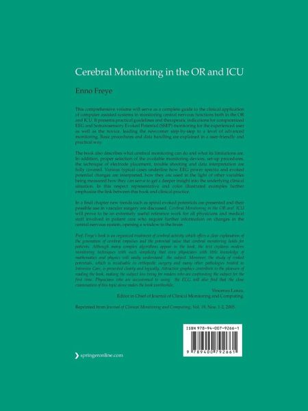 "Prof. Freye's book is an organized treatment of cerebral activity which offers a clear explanation of the generation of cerebral impulses and the potential value that cerebral monitoring holds for patients. Although many complex algorithms appear in the book, the text explains modern monitoring techniques with such simplicity that even physicians with little knowledge of mathematics and physics will easily understand the subject. Moreover, the study of evoked potentials, which is invaluable in orthopedic surgery and many other pathologies treated in Intensive Care, is presented clearly and logically. Attractive graphics contribute to the pleasure of reading the book, making the subject less tiring for readers who are confronting the subject for the first time. Physicians who are accustomed to using the ECG will also find that the close examination of this topic alone makes the book worthwhile."