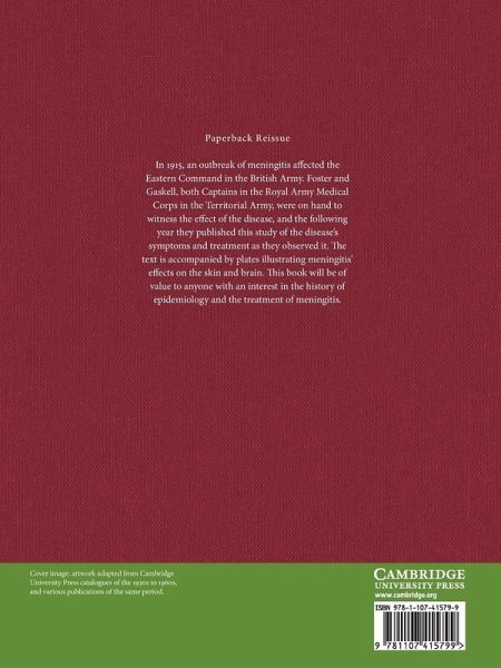In 1915, an outbreak of meningitis affected the Eastern Command in the British Army. Foster and Gaskell, both Captains in the Royal Army Medical Corps in the Territorial Army, were on hand to witness the effect of the disease, and the following year they published this study of the disease's symptoms and treatment as they observed it. The text is accompanied by plates illustrating meningitis' effects on the skin and brain. This book will be of value to anyone with an interest in the history of epidemiology and the treatment of meningitis.